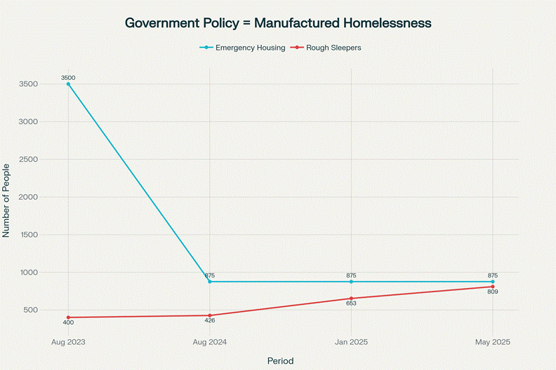 The government brags about “achieving” its emergency housing target five years early—by kicking people out of motels without alternative housing. They call this “ending the motel generation.” The reality? Creating a generation sleeping in cars, doorways, and under bridges.[10]