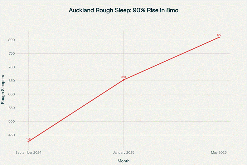 Auckland rough sleeping has increased 90% from September 2024 to May 2025, coinciding with government policy changes to emergency housing.