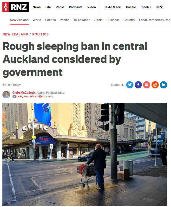 Auckland City Missioner Helen Robinson states the obvious: “People who are rough sleeping are human beings, and any kind of enforcement approach is not only not good, but it’s also ineffective”. Housing First Auckland programme manager Rami Alrudaini warns that enforcement approaches “only displace the problem and cause more harm”. Yet ACT leader David Seymour—who wasn’t even consulted on the rough sleeping ban proposals—asks the right question: “If you ban homelessness, where do people actually go?”[43][1]