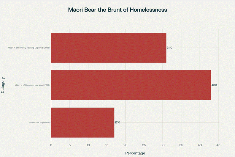 Māori make up 17% of the population but represent 43% of Auckland’s homeless and 31% of all severely housing deprived New Zealanders.